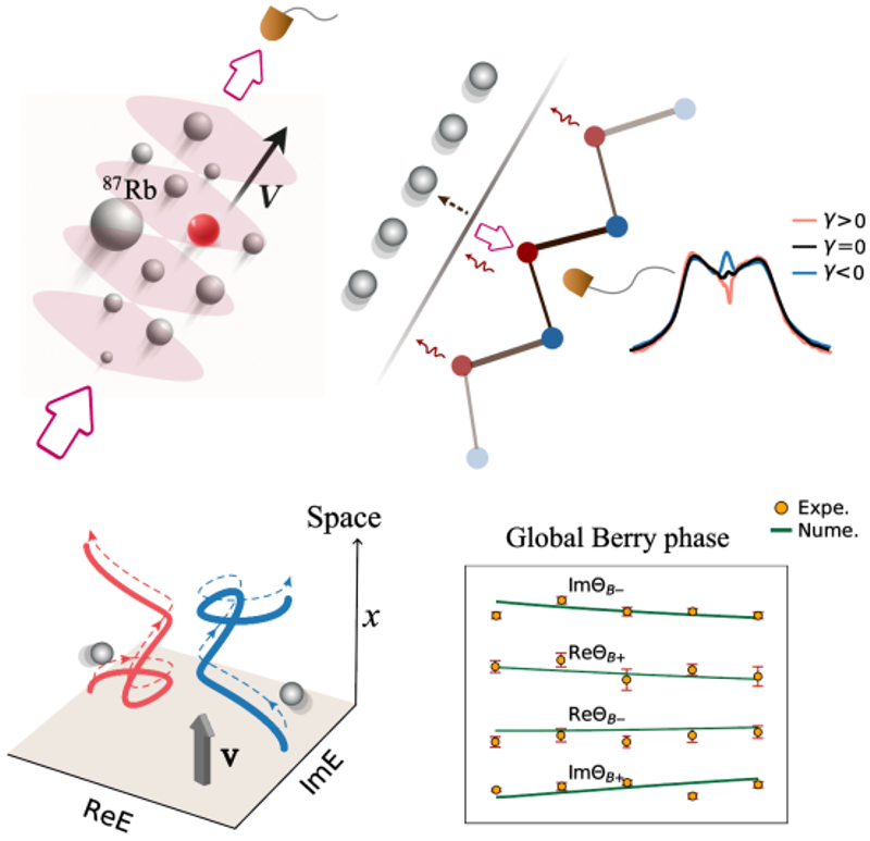 图片说明:从左到右依次为原子系综和驻波光场相互作用、非厄米晶格模型,以及全局Berry相位实验测量和理论模拟结果