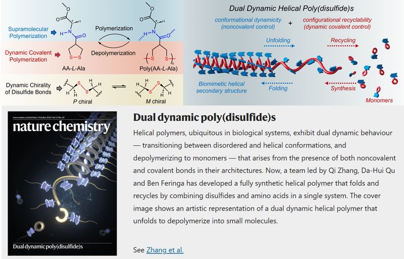 近日,我校化学与分子工程学院费林加诺贝尔奖科学家联合研究中心(以下简称诺奖中心)研究人员张琦、曲大辉、费林加在动态聚合物方面取得研究进展。相关研究成果以“Dual Dynamic Helical Poly(disulfide)s with Conformational Adaptivity and Configurational Recyclability”为题在线发表于《自然·化学》(Nat. Chem. 2025, 17, 1462–1468),并入选当期封面。