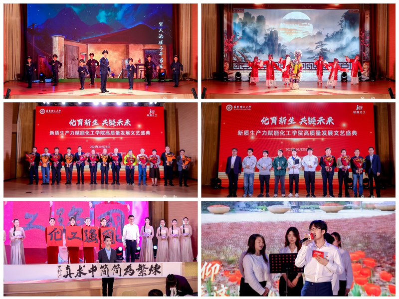 10月25日,在学校73周年校庆之际,化工学院举行了“化育新生•共链未来”—新质生产力赋能化工学院高质量发展文艺盛典。我校校长轩福贞,校党委副书记沈海涛,副校长李涛、阎海峰、李春忠,中国工程院院士袁渭康,欧洲科学院院士陈德,学校相关职能部处负责人,化工学院退休老领导,学院现任领导班子成员,学院校友理事会代表,党建联建单位代表,校友代表和在校师生代表齐聚一堂,共同欣赏这场文化盛宴。