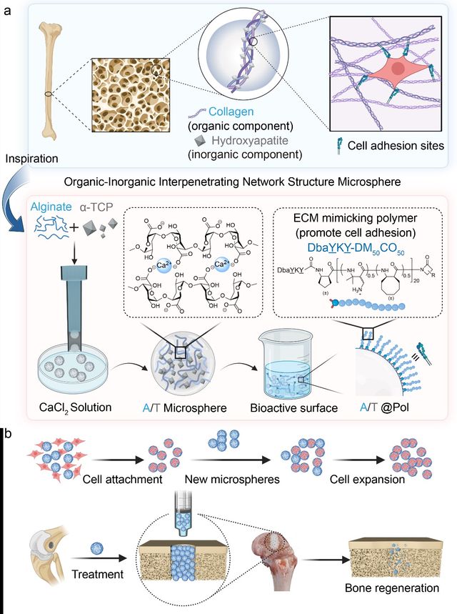 基于骨水泥的微创再生疗法在骨缺损修复领域具有重要应用价值。聚甲基丙烯酸甲酯(PMMA)和磷酸钙骨水泥(CPC)是最常见的两种骨水泥。然而,PMMA骨水泥存在不可降解、不可吸收,以及在体内凝固时放热过多等固有缺陷。尽管CPC的成分与天然骨相似,但其力学性能较差、易溃散等缺点限制了实际应用。且这些可注射型骨水泥通常缺乏孔隙率,不利于细胞和血管的长入从而影响骨修复效果。近年来,微球化骨修复材料因其独特的优势备受关注。微球化骨水泥能够以最小侵入创口填充任何几何形状的缺损,并且自然堆叠的微球之间会形成微米级的孔隙。这些孔隙为内源性细胞提供了迁入和营养代谢的通道,同时有助于血管网络的形成。然而,现有单一组分体系如水凝胶或磷酸钙微球难以实现理想的骨修复效果。