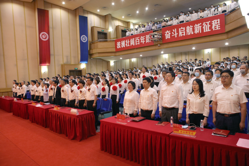 波澜壮阔百年路,奋斗启航新征程。为庆祝党的百年华诞,表彰先进典型,弘扬榜样力量,7月1日下午,学校召开庆祝中国共产党成立100周年大会。逸夫楼报告厅内,两排红旗鲜艳夺目,金色党徽熠熠生辉,“1921-2021”的字样醒目耀眼,将会场映衬得分外喜庆。校党委书记杜慧芳,校长、党委副书记轩福贞,校党委副书记陈麒,校党委副书记、纪委书记沈志超,副校长钱锋,校党委常委、副校长辛忠、胡宝国、李涛、王慧锋、朱为宏出席大会。大会由陈麒主持。