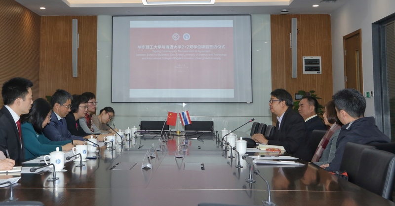 A Sino-Thai cooperative agreement on “2+2 Undergraduate Double Degree Program” was officially signed between the School of Business, ECUST and the Digital Innovation International College, Chiang Mai University in Thailand  on January 14th, 2019. Professor Yan Haifeng, Dean of the School of Business, Ms.Huang Jie, Director of the Department of Academic Affairs, ECUST, Bao Hua, Associate Dean of the School of International Education, Dong Linping, Vice President of the School of Business, Zhao Yan, Deputy Dean of the School of Business, and Opasit Chakpitak, Dean of the School of Digital Innovation, Wera Phaphuangwittayakul, Deputy Dean of the School of Digital Innovation, Assitant Dean Kanya Hirunwattanapong, and Annop Thanachana, Director of the Research Center participated in the signing ceremony as the Chinese and Thai representatives repectively. Zhao Yan presided over the signing ceremony.