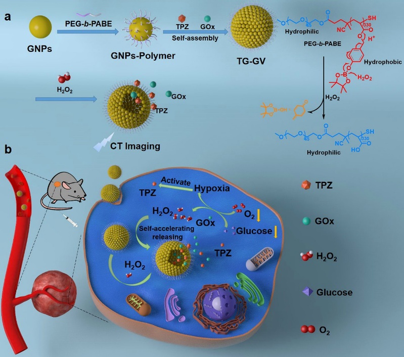 Recently, Professor Zhu Weiping from School of Pharmacy, ECUST,  developed and innovated a self-accelerating hydrogen peroxide stimulation-responsive gold nanovesicle, which realized the synergistic treatment of tumor chemotherapy and hunger treatment in mice. The related research paper was published in the biomedical journal Theranostics under the title of “Self-Accelerating H2O2-Responsive Plastic Nanovesicles for Synergistic Chemo/starring Therapy of Tumors”.