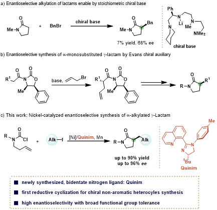 Recently, based on the previous research of nickel-catalyzed carbonylation reaction, the research group of Chen Yifeng, from the School of Chemistry and Molecular Engineering of ECUST, developed a brand-new chiral ligand skeleton Quinim , and successfully accomplished the construction of chiral α-alkyl substituted γ -lactam through asymmetric acyl-alkyl bifunctional reaction of olefins (Figure 1c).The research paper “Quinim: a New Ligand Scaffold Enabled Nickel-Catalyzed Enantioseselective Synthesis of α-Alkylated γ-Lactam” was recently published on j.am.chem.soc.