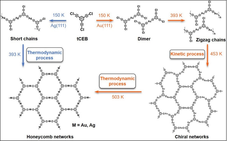 Recently, with a research focus on on surface synthesis and reaction mechanism, the research group of Professor Liu Peinian from School of Chemistry and Molecular Engineering, ECUST designed the precursor molecules of phenyl alkynyl chloride with C3 symmetry, realizing the stabilization of metal-organic intermediates through several pπ-dπ actions by using the high stability of bonds in alkynyl chloride functional groups.The related achievements have recently been published online in . Am. Chem. Soc. 2020, doi:10.1021/jacs.0c04311 under the title of “Atomic-Scale Visualization of Stepwise Growth Mechanism of Metal-Alkynyl Networks on Surfaces”.