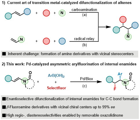 Recently, the research group headed by Professor Chen Yifeng from School of Chemistry, ECUST  has made new progress in the research field of palladium-catalyzed asymmetric bifunctional group of acrylamide.The related research paper titled “Palladium-Catalyzed Regio-,Diastereo-,and Enantioseselective 1,2-arylfluorination of internal enamides” was published in Angew. Chem. Int. Ed.
