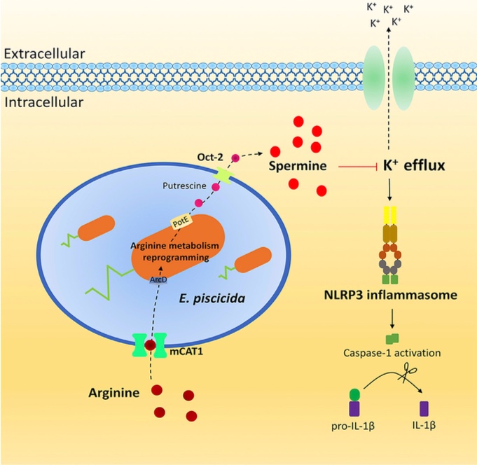 Recently, Cell Reports, a sub-journal of Cell, published online the research on the molecular mechanism of interaction between Edwardsiella piscicida, a key pathogenic bacterium in aquaculture, and macrophages by Professor Liu Qin, School of Bioengineering, ECUST. It clarified that bacteria can use the polyamine pool of host cytoplasm through arginine metabolism pathway, and realize the escape of macrophage NLRP3 inflammatory corpuscle.