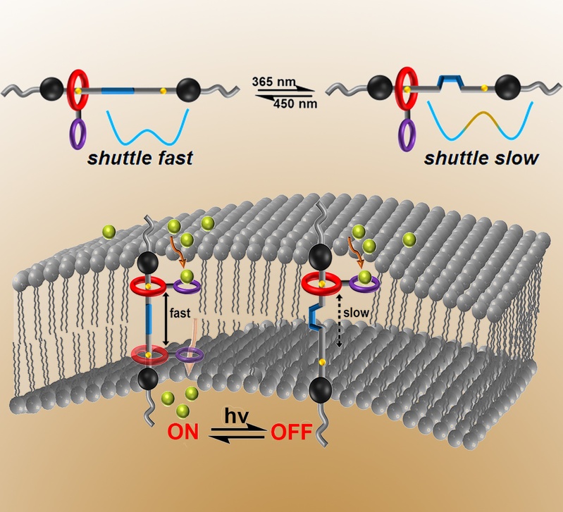 Recently, Professor Bao Chunyan and Professor Qu Dahui from the School of Chemistry and Molecular Engineering of ECUST cooperated to further realized gated ion transport on the basis of high efficiency and ion selectivity by introducing azobenzene photoisomerization group to realize reversible ON/OFF ion transport across the membrane through optically controlling rotaxane shuttling. The related research article entitled “A Light-Operated Molecular Cable Car for Gated Ion Transport” was published in Angew and te Chemie International Edition.