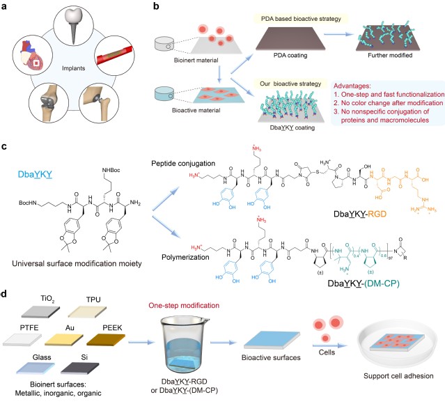 Recently, the research group of Professor Liu Runhui from the School of Materials Science and Engineering, ECUST has made new progress in the field of surface biological activation. The research article was published in the Journal of the American Chemical Society with the title “Universal and one-step modification to render diverse materials biological activation”.
